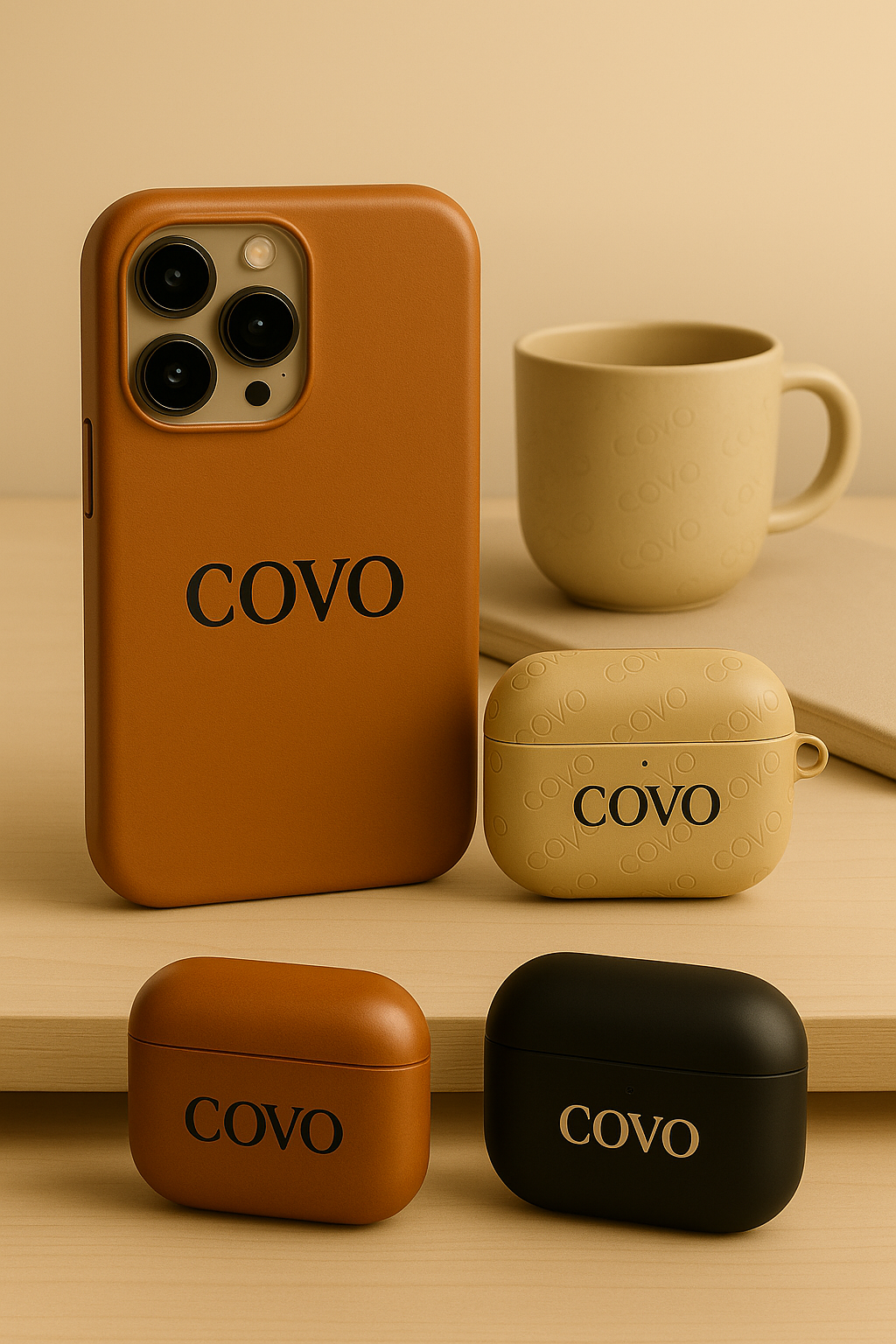 Full-wrap iPhone 14 Pro Max/IPhone 17 case in beige sand, featuring a tonal diagonal COVO monogram and bold centered logo. A refined, modern unisex accessory inspired by luxury fashion houses.